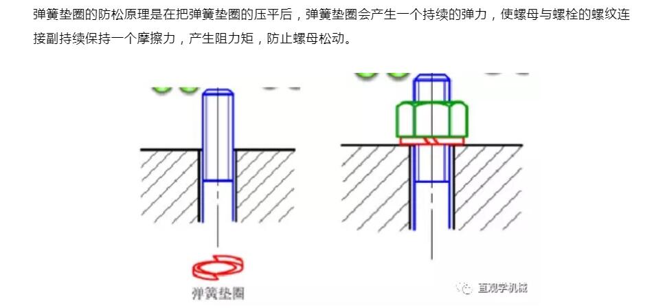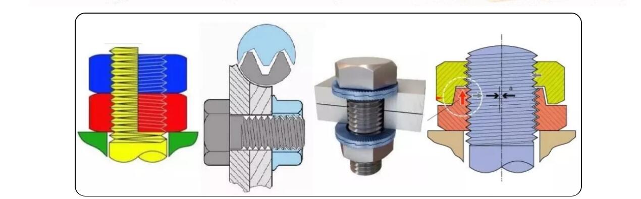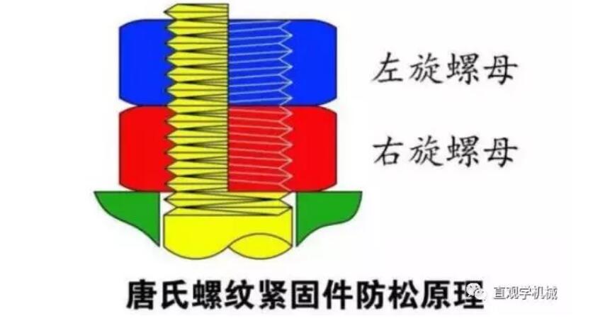 唐氏螺紋防松原理:唐氏螺紋緊固件也是采用雙螺母防松,但是,兩個(gè)螺母的旋轉(zhuǎn)方向相反。在沖擊和振動(dòng)載荷作用時(shí),第一摩摩擦力面的摩擦力會(huì)減小和消失,