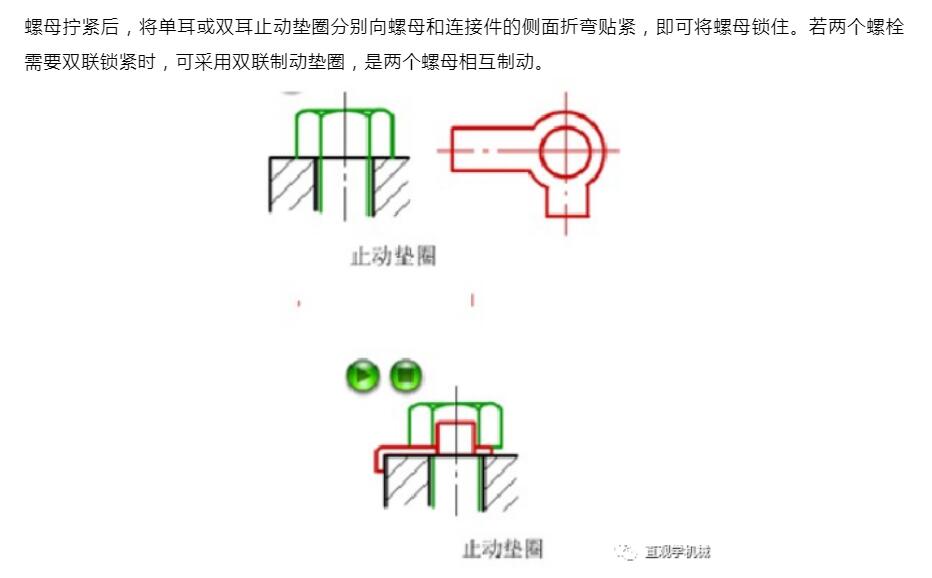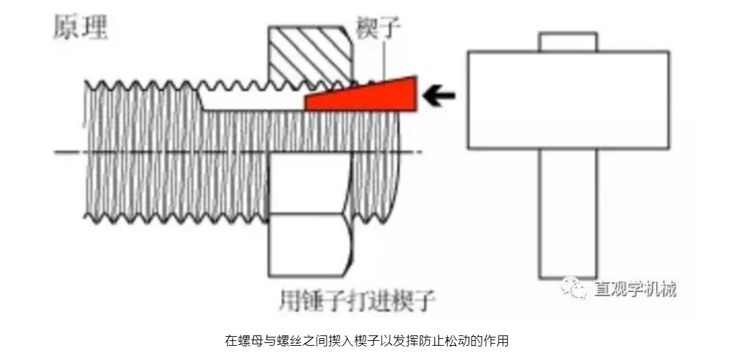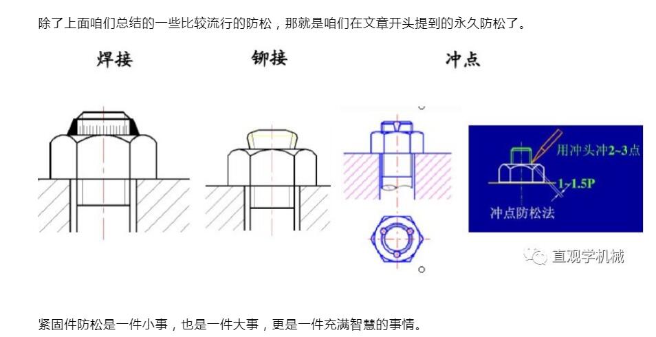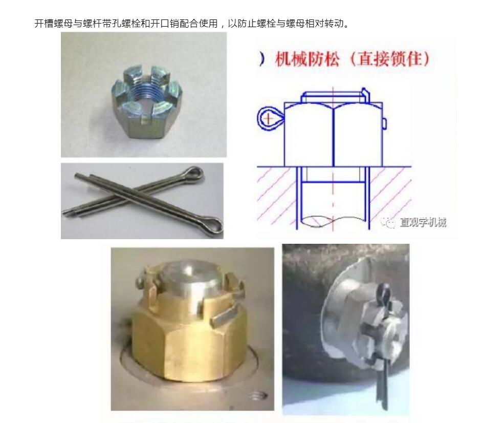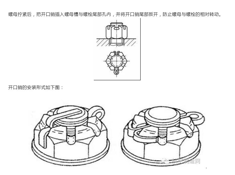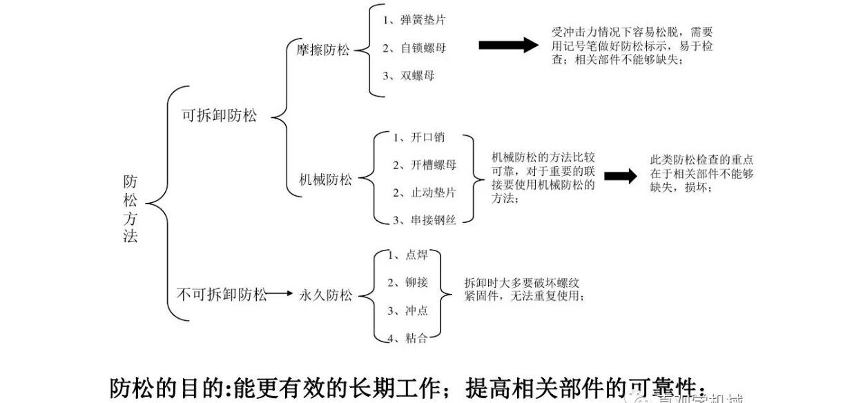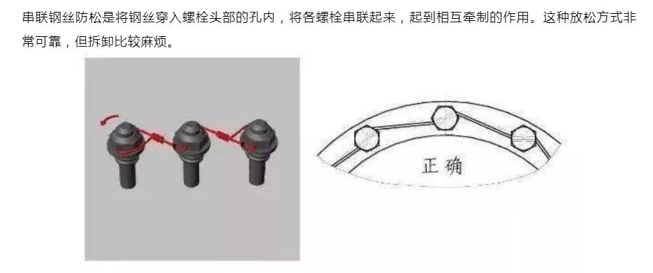 常用的防松方法有三種:摩擦防松、機(jī)械防松和永久防松。機(jī)械防松和摩擦防松稱為可拆卸防松,而永久防松稱為不可拆卸防松。常用的永久防松有:點(diǎn)焊、鉚接、粘合等,這種方法在拆卸時(shí)大多要破壞螺紋緊固件,無(wú)法重復(fù)使用。常見(jiàn)摩擦防松有:利用墊片、自鎖螺母及雙螺母等。常見(jiàn)的機(jī)械防松方法:利用開(kāi)口銷、止動(dòng)墊片及串鋼絲繩等。