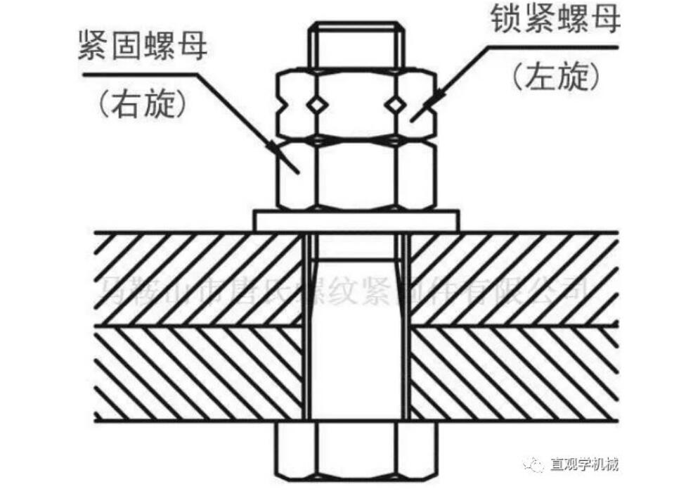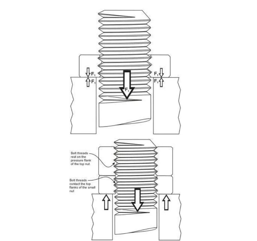 第一螺母(圖中右旋)會(huì)產(chǎn)生松退趨勢(shì),即螺母向左旋轉(zhuǎn)。但是第二螺母(圖中左旋)的旋向與第一螺母的旋向相反,因此第一螺母的松退力直接轉(zhuǎn)換成第二螺母的擰緊力。這樣,螺母萬(wàn)萬(wàn)不會(huì)松退。