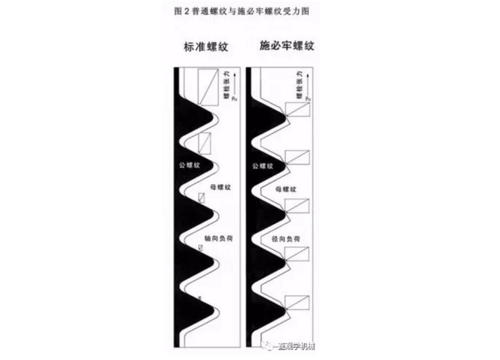 由于牙形的角度改變,使施加在螺紋間接觸所產(chǎn)生的法向力與螺栓軸成60度角,而不是像普通螺紋那樣的30度角。顯然30°楔形螺紋法向壓力遠(yuǎn)遠(yuǎn)大于扣緊壓力,因此,所產(chǎn)生的防松摩擦力也就必然大大增加了。