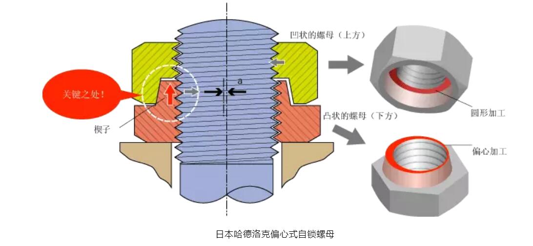 對(duì)頂防松螺母原理:雙螺母防松時(shí)產(chǎn)生兩個(gè)摩擦力面,第一摩擦力面是螺母與被緊固件之間,第二摩擦力面是螺母與螺母之間。安裝時(shí),第一摩擦力面的預(yù)緊力為第二摩擦力面的80%。在沖擊和振動(dòng)載荷作用時(shí),第一摩擦力面的摩擦力會(huì)減小和消失,但同時(shí),第一螺母會(huì)被壓縮導(dǎo)致第二摩擦力面的摩擦力進(jìn)一步加大。螺母松退必須克服第一摩擦力和第二摩擦力,由于第一摩擦力減小的同時(shí)第二摩擦力會(huì)增大。這樣防松效果就會(huì)比較好。