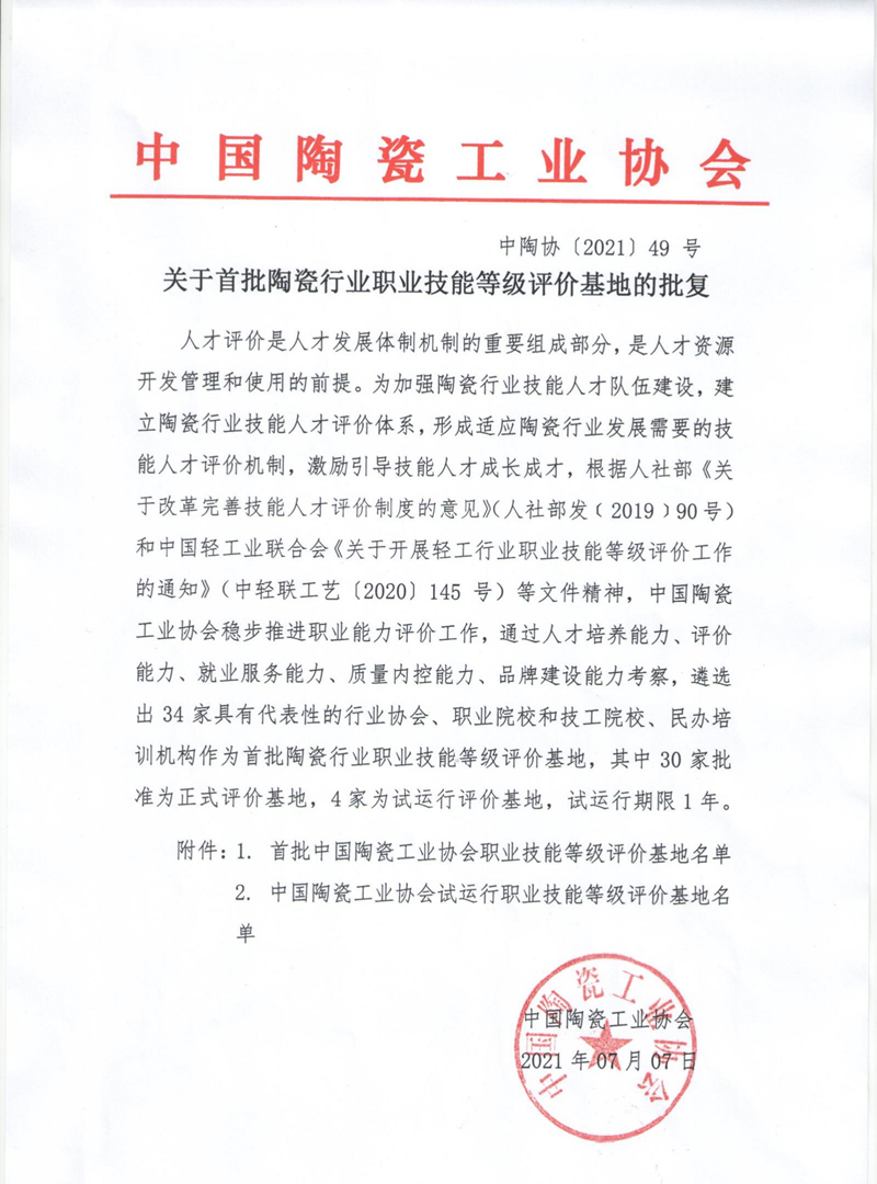 該批復(fù)的發(fā)布,是中國陶瓷工業(yè)協(xié)會(huì)對代表性行業(yè)協(xié)會(huì)、職業(yè)院校和技工院校、培訓(xùn)機(jī)構(gòu)的肯定和認(rèn)可,也說明百陶會(huì)已完全具備陶瓷職業(yè)技能培訓(xùn)和等級評價(jià)服務(wù)能力。